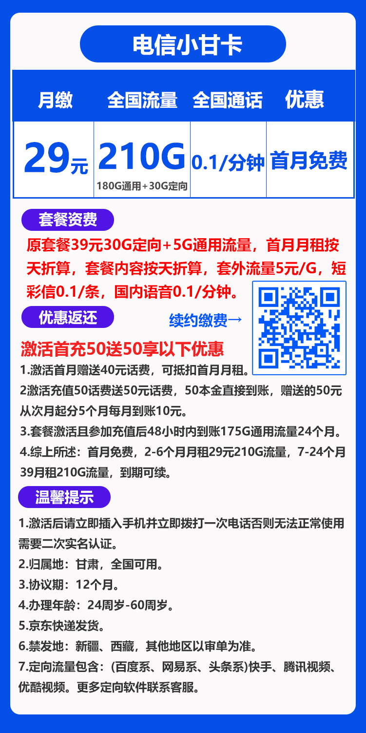 套餐构成:激活首充50送50享以下优惠1.激活首月赠送40元话费,可抵扣首月月租。2激活充值50话费送50元话费,50本金直接到账,赠送的50元从次月起分5个月每月到账10元。3.套餐激活且参加充值后48小时内到账175G通用流量24个月。4.综上所述:首月免费,2-6个月月租29元210G流量,7-24个月39月租210G流量,到期可续。