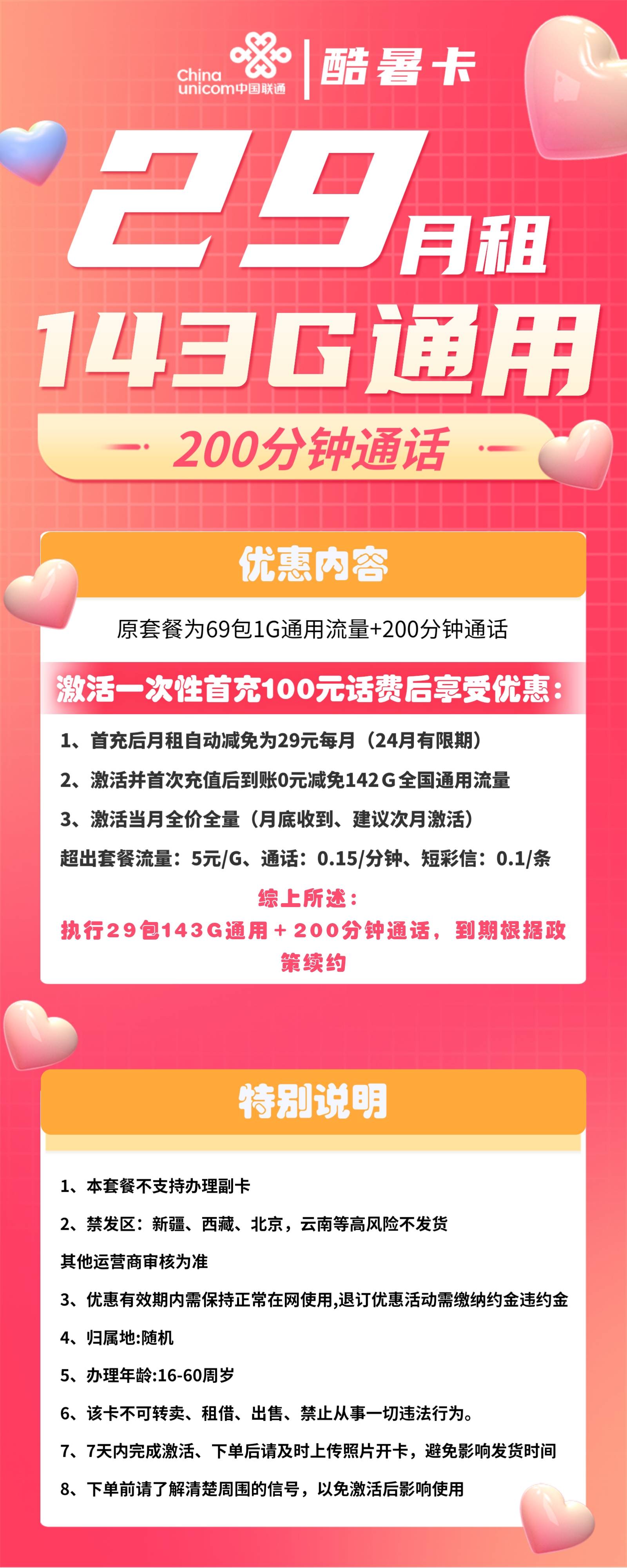 联通酷暑卡29元143G通用+200分钟通话