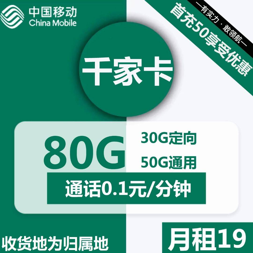 套餐:1893 | 移动千家卡19元包50G通用 30G定向 通话0.1元/分钟