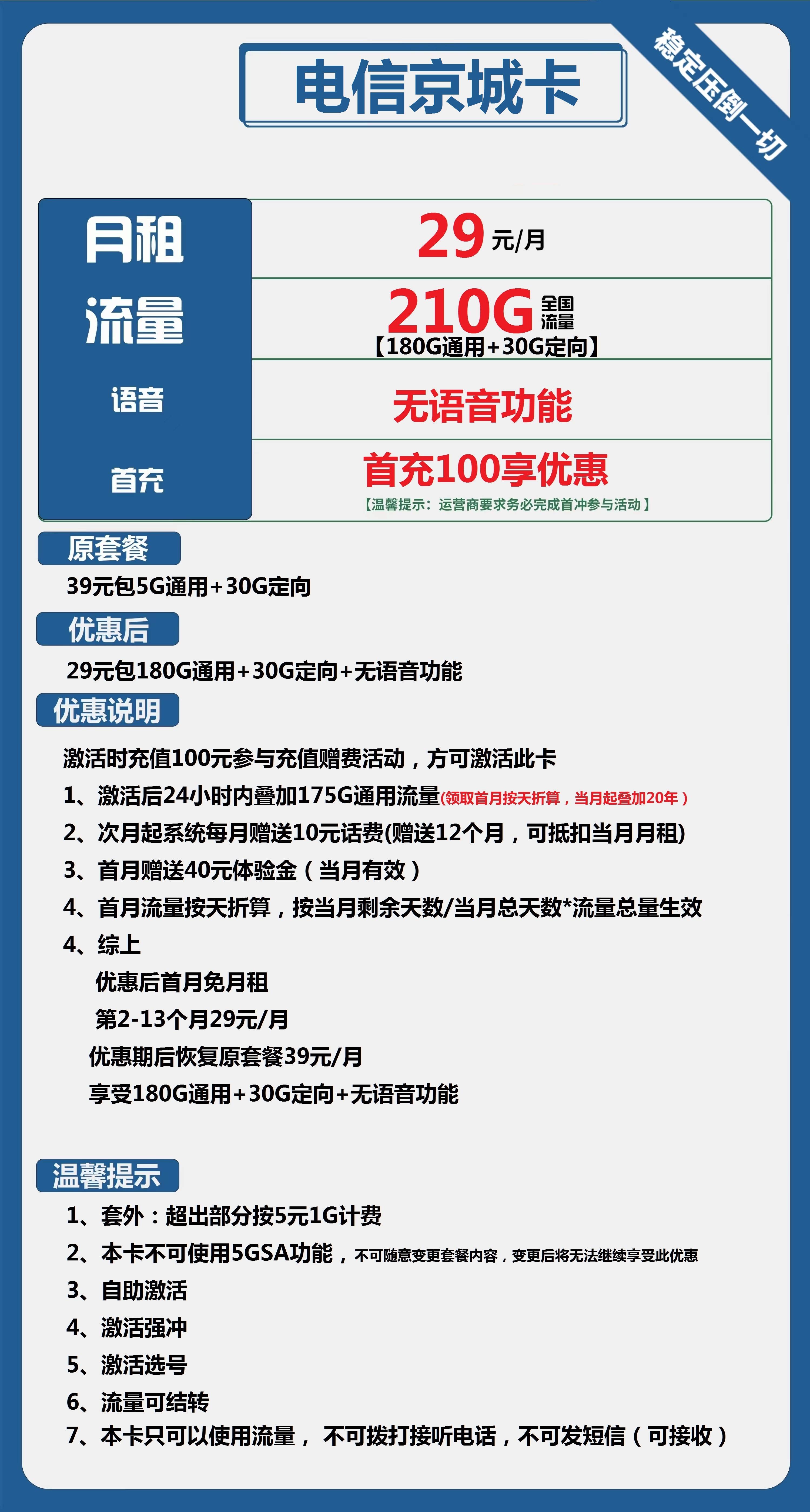 套餐:2014 | 电信京城卡29元包180G通用 30G定向 无语音功能