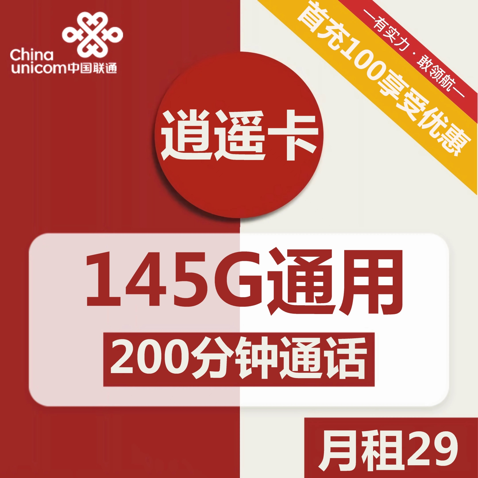 套餐:2029 | 联通逍遥卡29元包145G通用 200分钟通话