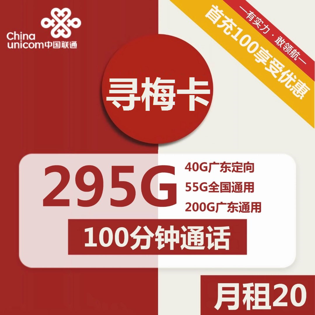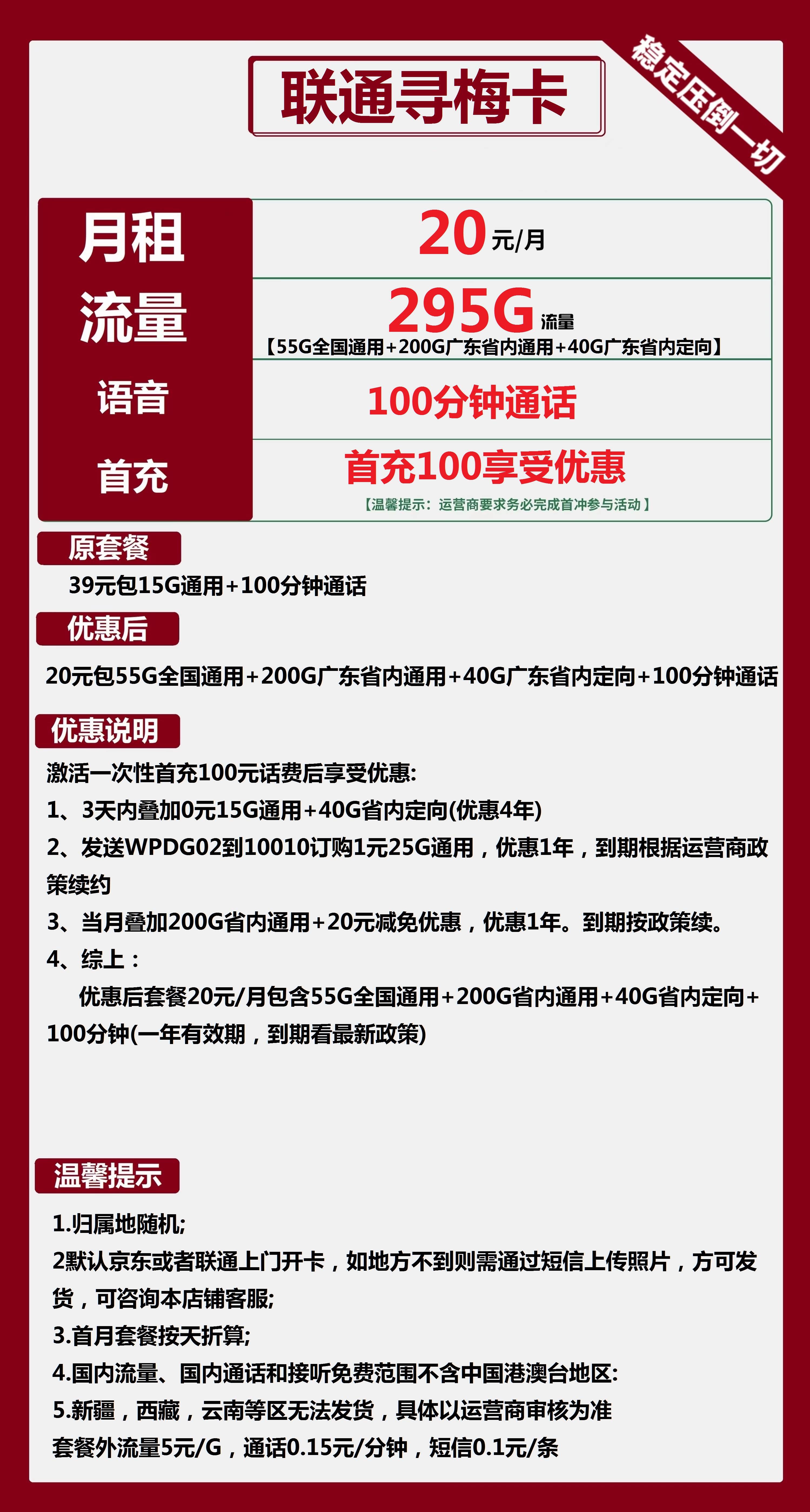 套餐:2049 | 联通寻梅卡20元包200G省内通用 55G全国通用 40G省内定向 100分钟