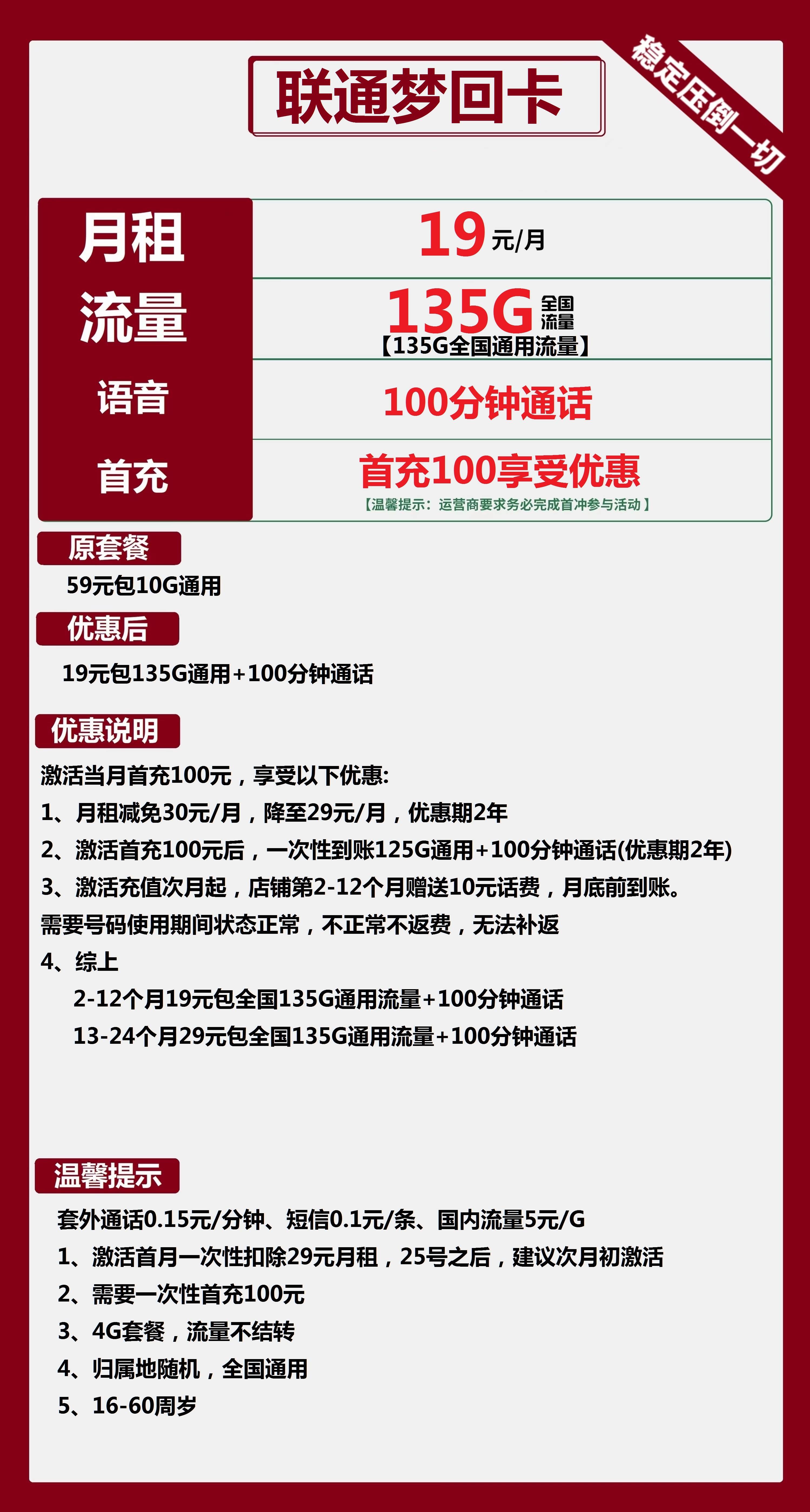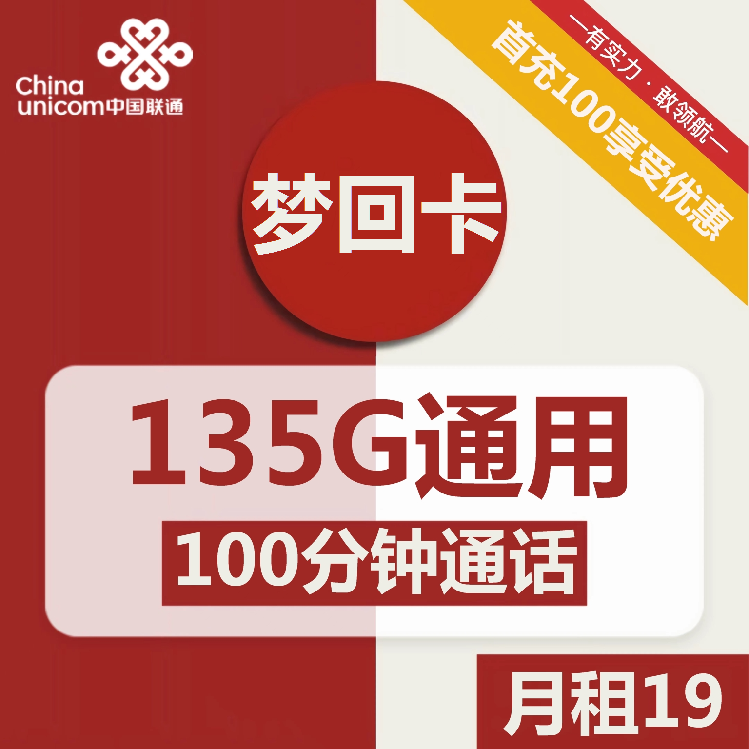 套餐:2069 | 联通梦回卡19元包135G通用 100分钟通话